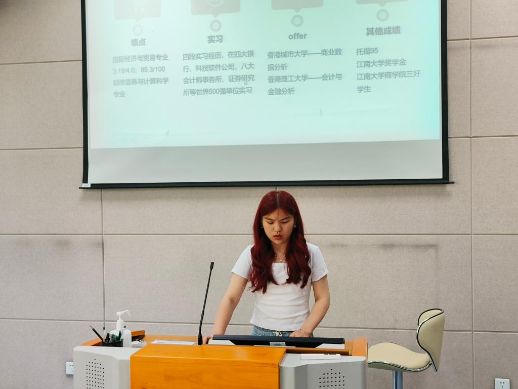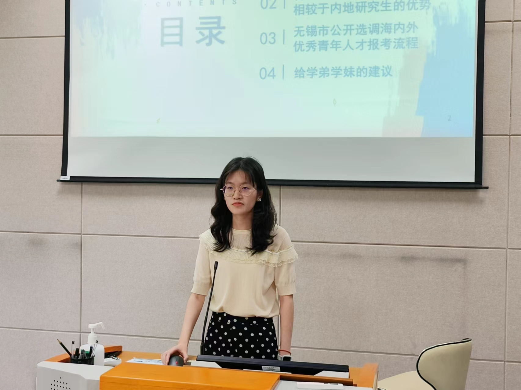 Following this, Zhang Yingfei from the 2018 cohort, who progressed to the Chinese University of Hong Kong and was selected for the Wuxi City Overseas Talents Program, shared her study experiences at the Chinese University of Hong Kong. She compared the training programs, professional courses, internship practices, and graduation requirements of domestic and overseas postgraduate studies and shared her preparation experience for the Wuxi City Overseas Talents Program. Zhang Jingyue, an accounting major who progressed to King's College London, shared her exchange experience at the University of Edinburgh, where she excelled and received the Jiangsu Provincial Government Overseas Student Scholarship. She advised younger students to plan their overseas study paths early, emphasizing that besides meeting language proficiency requirements, high-quality internships and study exchanges are key to successfully obtaining offers from prestigious universities. Duan Hejia, an international economics and trade major who progressed to Hong Kong Polytechnic University, mainly shared the basic requirements for applying to Hong Kong schools, GPA requirements, and TOEFL preparation. She outlined the timeline for overseas study applications and suggested that younger students focus on learning professional knowledge in their first and second years, strive to improve their GPA, and work towards securing their desired offers.