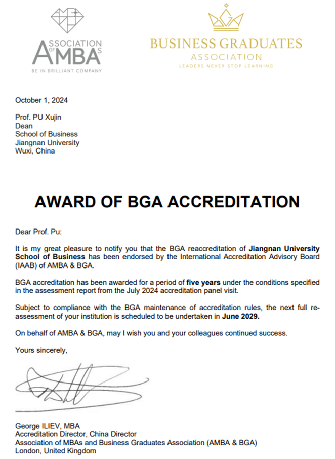 On October 1, 2024, while the entire nation celebrated the 75th anniversary of the founding of the People’s Republic of China, the School of Business at Jiangnan University received an official congratulatory email from the Association of MBAs (AMBA) and the Business Graduates Association (BGA) in the United Kingdom. The message congratulated the School on successfully achieving BGA (Gold Status) re-accreditation, with the maximum accreditation period of five years. This achievement follows the School of Business's previous successes in obtaining AMBA accreditation in 2018 and the joint AMBA & BGA accreditation in 2021, reaffirming the quality of its education, management training systems, and internationalization efforts.