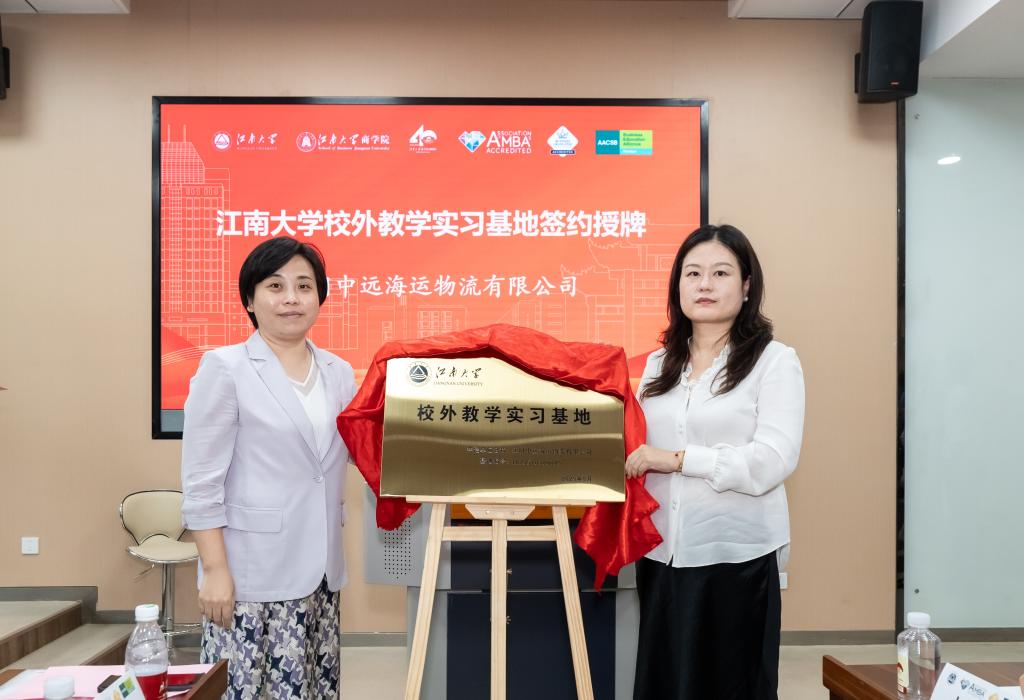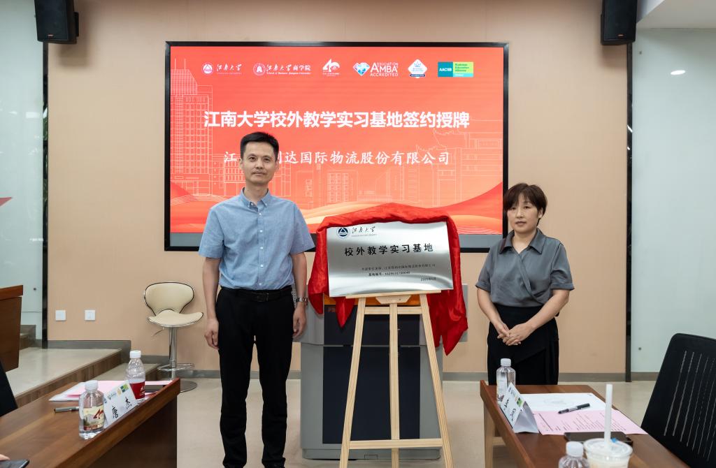 Mr. Zhou Chen, Deputy Director of the Graduate Affairs Office, and Ms. Feng Li, Manager at Jiangsu Jialida International Logistics Co., Ltd., unveiled the plaque for the new internship base