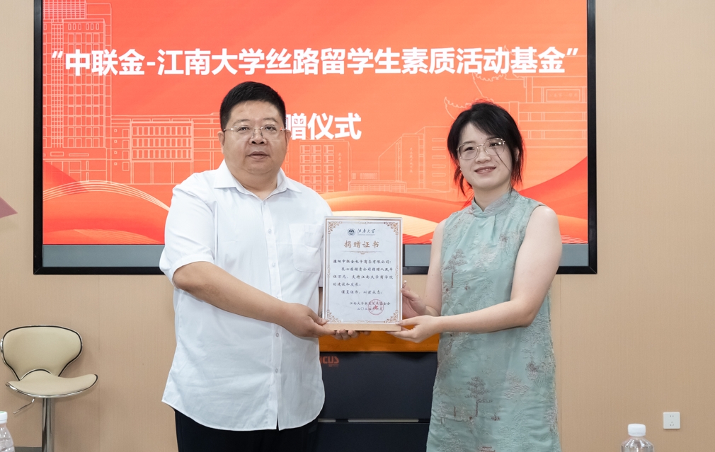 Zhonglianjin Group Wuxi Stainless Steel E-Commerce Center Co., Ltd. donated RMB 50,000 to the School of Business to establish the “Zhonglianjin–Jiangnan University Silk Road International Student Development Fund,” which will support future extracurricular and development activities for the international students. Mr. Changqing Liu presented a donation certificate to Ms. Bella, Marketing Director of Zhonglianjin Group.
