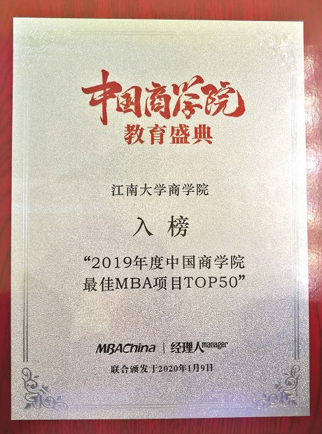 The MBA Program Center of Jiangnan University was invited to the ceremony. The MBA program of JNU was listed among the Top 50 MBA Programs in China in 2019, ranking 45th. Wu Ge, vice dean of the School of Business and director of the Center, won the “Award for Outstanding Operation of Business School in China in 2019”.