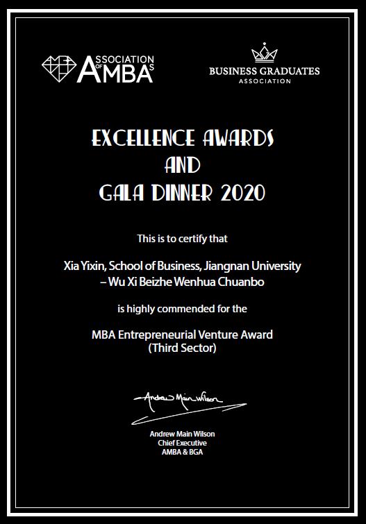 At the AMBA&BGA Excellence Awards Ceremony in London on the evening of February 7, Beizhe Wenhua, a non-profit organization founded by Xia Yixin, the deputy secretary-general of the MBA Alumni Association of School of Business and 2014 MBA alumnus, was shortlisted for “MBA Startup of the Year” (third party). It is the first of its kind for Jiangnan University and the only candidate team in Mainland China.