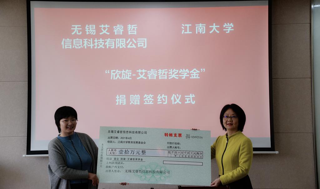 On the morning of April 28, General Manager Xu Jianxin and marketing director Lu Yajuan from Shanghai Xinxuan Consulting and Wuxi Airuizhe Information & Technology attended the donation ceremony for “Xinxuan-Airuizhe Scholarship” in 304 Conference Room in School of Business. Also present were Teng Lefa, dean of the School of Business, Dou Xinhua, deputy director of Social Resources Department, and Wang Yuhong, vice dean of the School of Business and director of MBA Program Center.