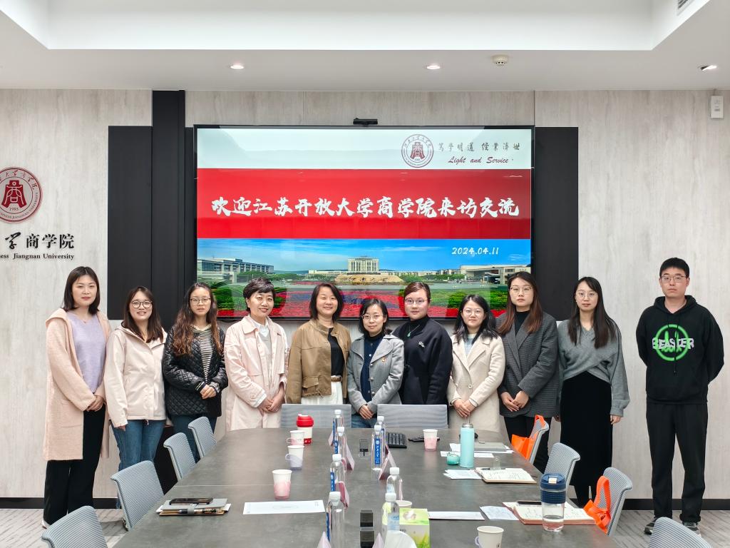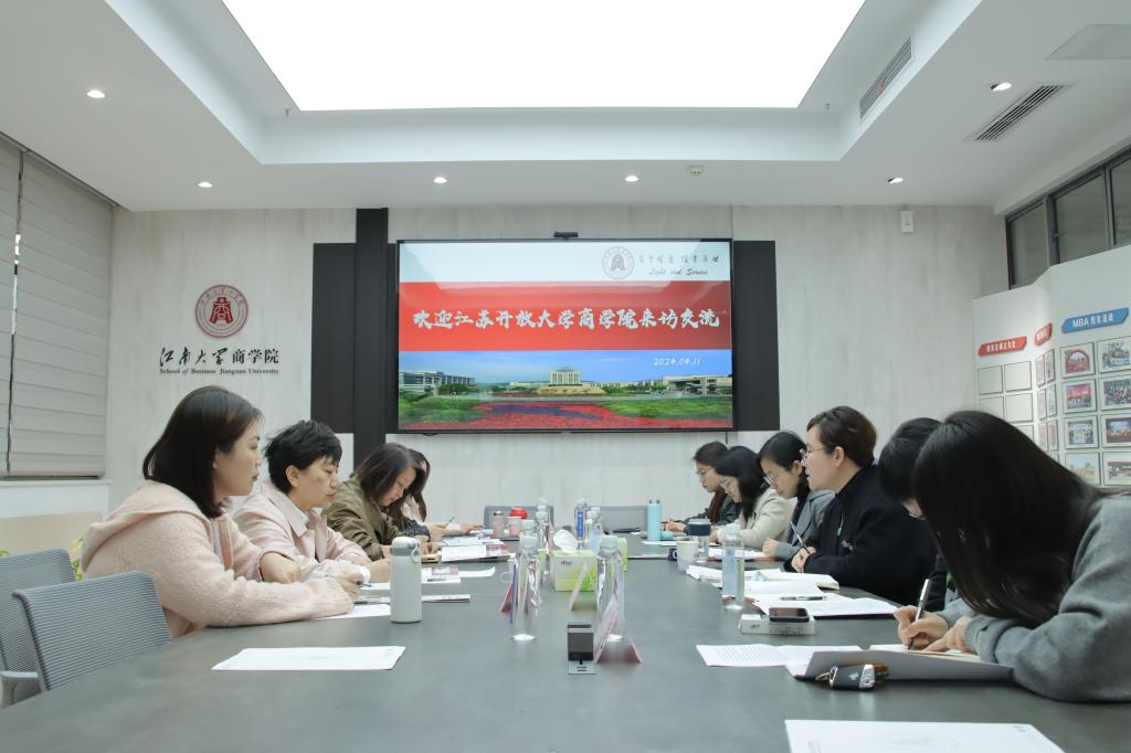 On the morning of April 11th, a delegation of five from the Jiangsu Open University Business School visited the Jiangnan University Business School for research and exchange. Ding Xiaohua, Deputy Secretary of the Party Committee of Business School, Jiangsu Open University , Xu Jing, Deputy Secretary of the Party Committee of School of Business, Jiangnan University Business School, along with directors of the student affairs offices and relevant counselors from both institutions participated in the research and discussion. The meeting was chaired by Xu Jing.
