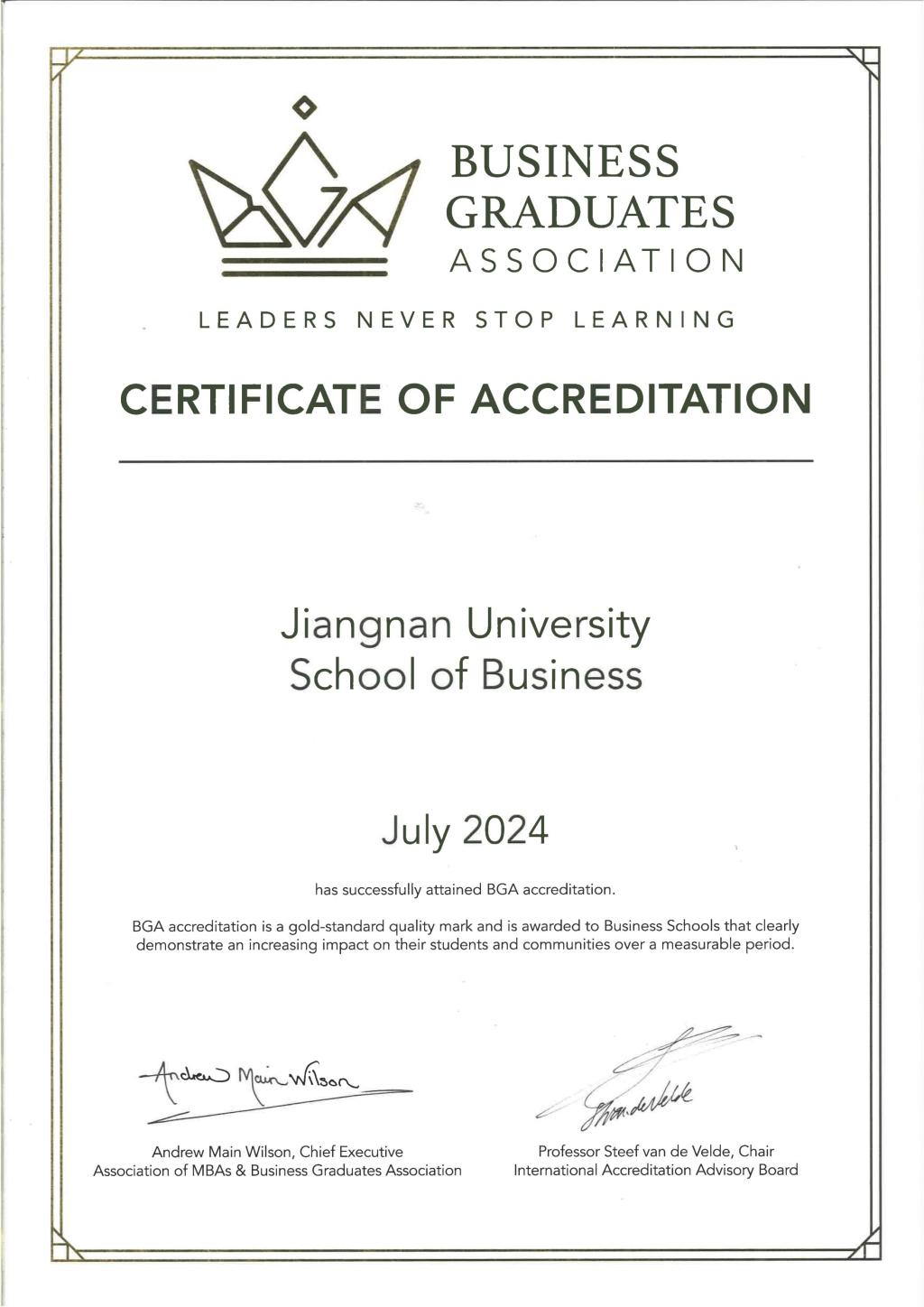 BGA Re-Accreditation Certificate Awarded to School of Business, Jiangnan University in 2024