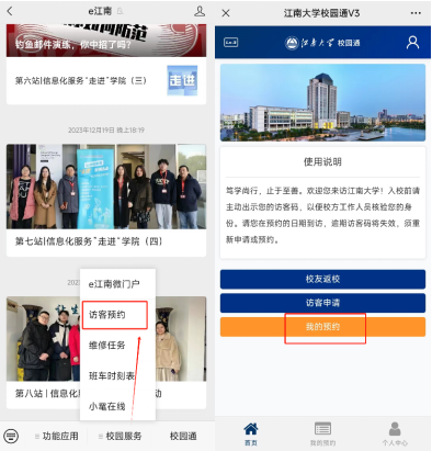 考核期间考生仅限学校东大门进出。考生进校需采用“访客预约”入校(手机关注“e江南”微信公众号,点击屏幕下方“校园服务”中的“访客预约”),如下图所示:
