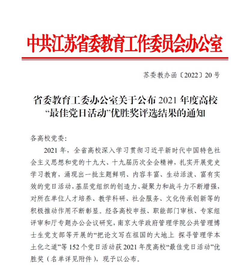 日前,江苏省委教育工委办公室下发了《关于公布2021年度高校“最佳党日活动”优胜奖评选结果的通知》,太阳成集团tyc33455cc党委组织开展的《老少携手学党史,民族团结育新人》活动获评全省高校“最佳党日活动”优胜奖。
