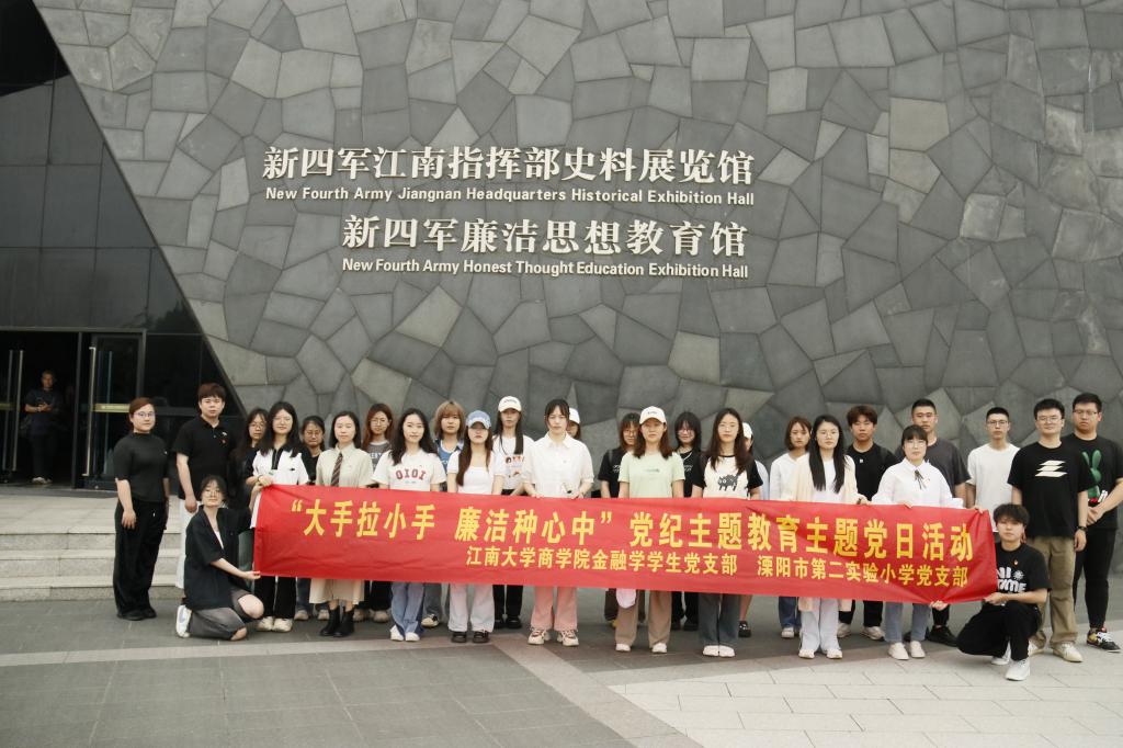为深入学习贯彻习近平新时代中国特色社会主义思想和党的二十大精神,加快构建“党建引领、资源共享、优势互补、协调发展”的基层党建工作新格局,扎实推进党纪学习教育走深走实,5月22日下午,太阳成集团tyc33455cc金融学学生党支部与溧阳市第二实验小学党支部在新四军廉洁教育纪念馆和溧阳市第二实验小学开展“大手拉小手,廉洁种心中”结对共建签约活动。溧阳市第二实验小学党支部书记兼校长蔡雪飞、副书记兼副校长朱永康、纪检委员兼副校长吕加良、组织委员兼副校长黄秀妹、副校长吴薇、太阳成集团tyc33455cc分团委书记兼学工办主任王璁、太阳成集团tyc33455cc金融学学生党支部书记吴松与两支部全体同志30余人参加活动。活动由溧阳市第二实验小学党支部宣传委员张晓主持。