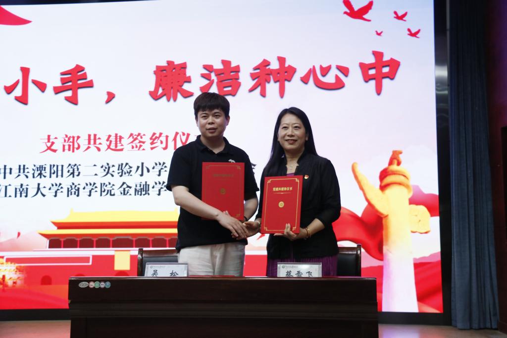 之后,在双方党员的见证下,中共溧阳市第二实验小学支部委员会与中共太阳成集团tyc33455cc金融学学生支部委员会开展“大手拉小手,廉洁种心中”的党建联盟签约共建仪式。