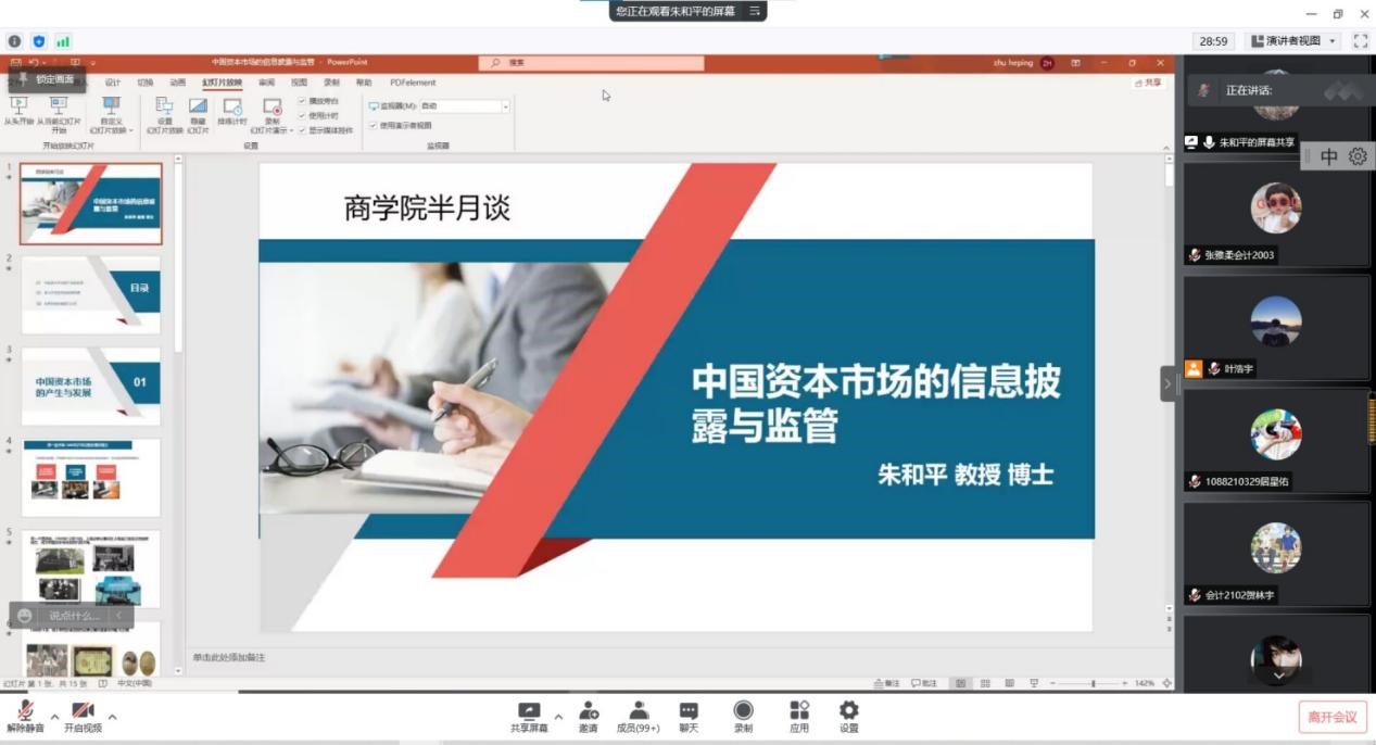 4月22日下午,太阳成集团tyc33455cc第155期“半月坛”系列讲座通过腾讯会议平台在线举行。太阳成集团tyc33455cc会计学专业教授朱和平作为主讲嘉宾,为我院150余名本科生做了题为“中国资本市场的信息披露与监管”的专题讲座。