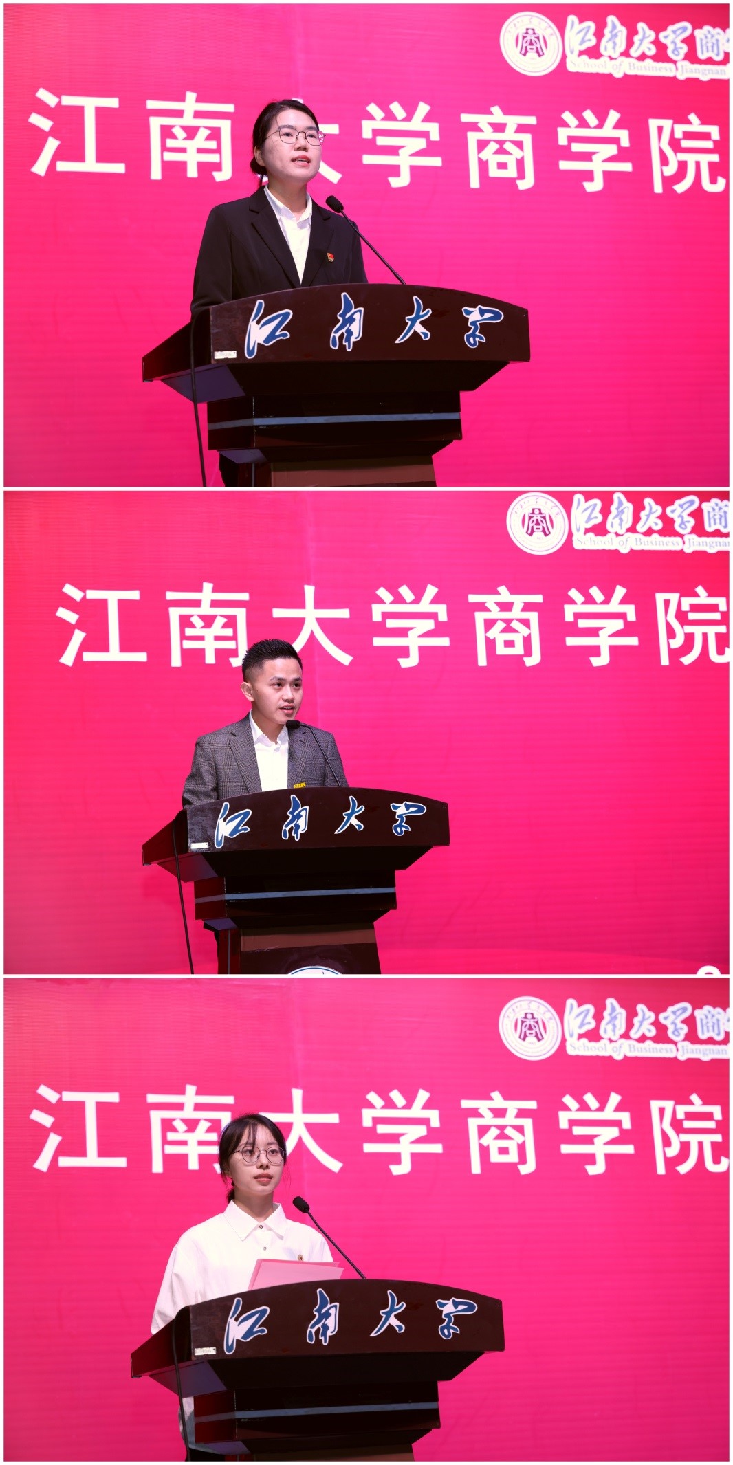 在校研究生代表余莉攀、MBA教育中心研究生新生代表孙健、本科生新生代表乔偌婷依次发言