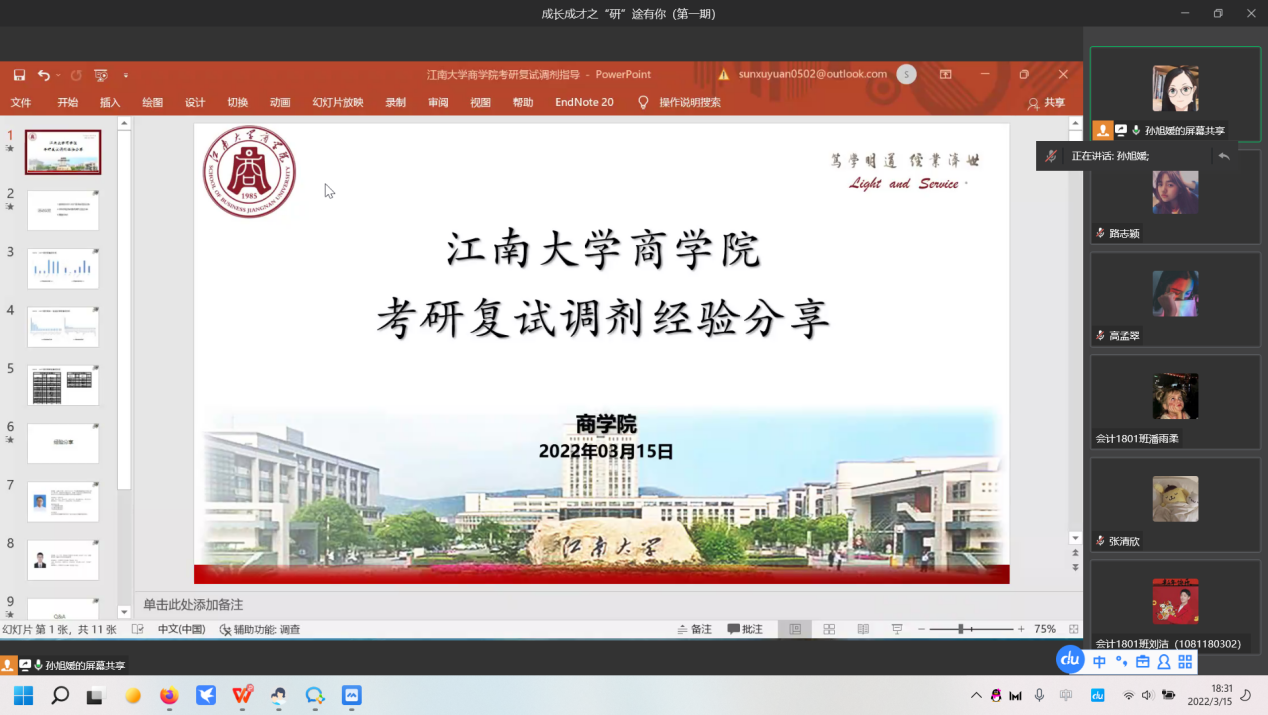 3月15日至17日,太阳成集团tyc33455cc2022年成长成才系列讲座“研”途有你——考研复试调剂经验分享会在线上企业微信和太阳成集团tyc33455cc304会议室同步开展。活动共两期,分别邀请了2017级朱旭恒、倪梓涵、陈芳、余姝琼四位成功上岸的学长学姐为分享嘉宾。太阳成集团tyc33455cc党委副书记兼副院长徐静出席,升学就业工作辅导员孙旭媛老师主持,累计105名学生参加。