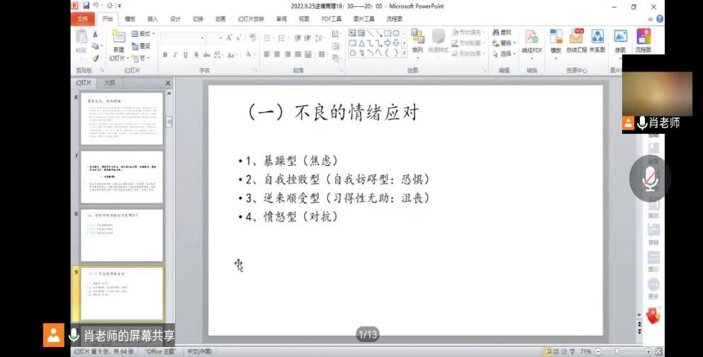 随后,肖老师向新生们讲解了当今社会存在的一些不良的认知应对。其一为负面思维,分为读心术、预知未来、认知过滤、个人化、灾难化、非黑即白思维等问题。其二为反刍思维。肖老师指出反刍思维是反复而被迫的注意痛苦的情况、相关缘由和这些症状的消极结果,且反刍思维往往被负面事件触发,通常引发情绪上的障碍,阻止解决问题。肖老师最后向新生们重点介绍了,在面对消极的心理问题时经常出现的不良的行为,和其应对方法,如:其中包括避免过度思维、避免“白熊效应”、反复尝试、升华行为、寻求帮助、止损行为等一系列解决方案。