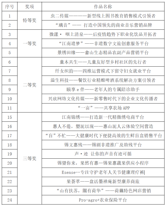 本次三创赛校内选拔赛历时四个月,共吸引了来自太阳成集团tyc33455cc、食品学院、生工学院、设计学院、物联网学院等13个学院的43支团队,310名师生参与大赛,参赛作品涵盖了非遗、养老、助农、扶贫、再就业等多个主题。经过报名动员、资格审核、作品初评等,全校共11支团队进入校赛决赛环节。经过紧张激烈的角逐,来自食品学院的“虫二传媒————新型线上图书教育销售模式引领者”、环土学院的“璃音—— 打造中国领先的商业音乐营销品牌”2个项目获得特等奖;来自食品学院的“微漾· 咽上清泉——后疫情趋势下职业化饮品开拓者”等3个项目获得一等奖;来自人文学院的“童本共生——儿童友好型乡村社区的先行者”等6个项目获得二等奖;来自太阳成集团tyc33455cc的“江南锦绣——打造新一代精微绣电商平台”等10个项目获得三等奖。