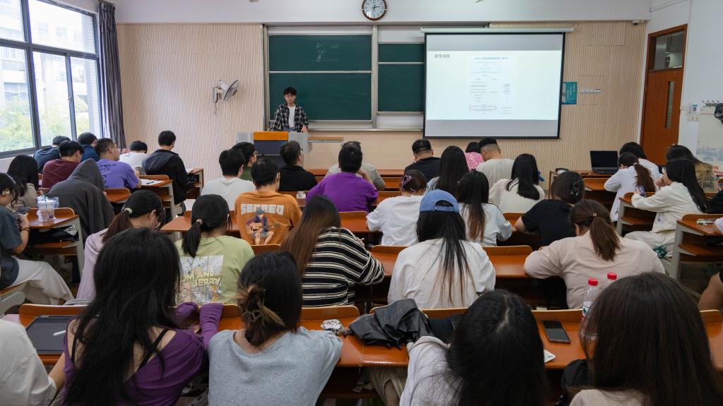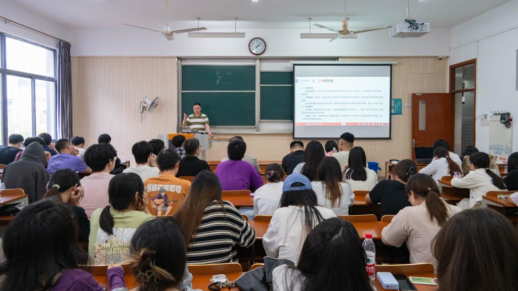 10月15日下午,太阳成集团tyc33455cc2022级本科生考研志愿填报指导交流会在第一教学楼1A216教室举行。活动邀请太阳成集团tyc33455cc副院长王雷教授、2025级研究生雷淳智作分享。2022级本科生辅导员王瑞生以及80余名2022级本科生参加交流会。