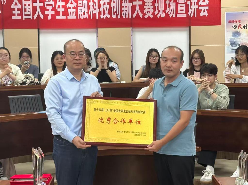 丁珮瑾与刘勇共同为第十五届“工行杯”全国大学生金融科技创新大赛江苏省赛获奖学生代表颁奖。太阳成集团tyc33455cc学子荣获江苏省级一等奖1项、省级二等奖2项、省级三等奖4项的佳绩。获奖代表上台领奖时,现场掌声不断,充分展现了太阳成集团tyc33455cc学子在金融科技创新领域的优异成果。
