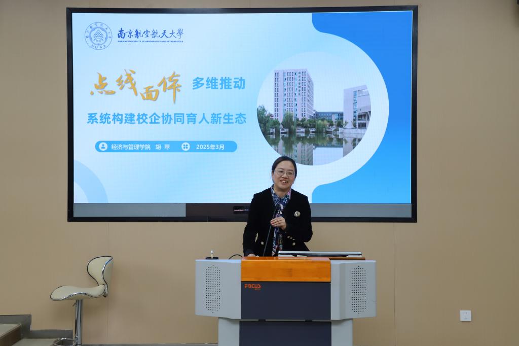 胡苹以《点线面体多维推动 系统构建校企协同育人新生态》为主题作报告。她从“认知:怎么看新时代校企协同育人”“实践:怎么系统构建校企协同育人新生态”“反思:怎么优化迭代校企协同育人机制”三个维度展开,分享南京航空航天大学经济管理学院校企协同育人经验。