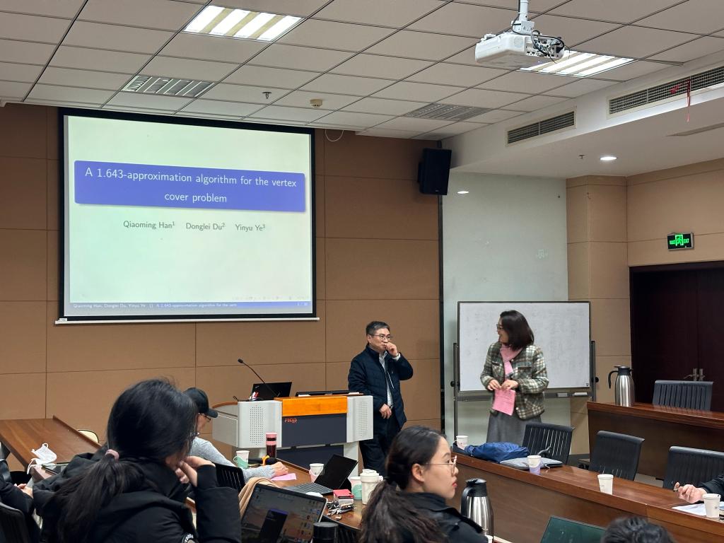 随后,韩乔明教授介绍了其近些年在点覆盖问题方面的研究进展。点覆盖问题是组合优化领域中的经典问题之一,在计算复杂性理论和近似算法领域都占有重要的地位。Karp在其具有里程碑意义的工作中《Reducibility Among Combinatorial Problems》首次将点覆盖问题确定为21个NP完全问题之一。1981年,Bar-Yehuda和Even利用原始对偶算法得到该问题的2-近似比,从那以后,再也没有严格意义上更好的近似比结果。韩乔明教授创新性提出一个近似算法,有望可以改进目前2-近似的结果。