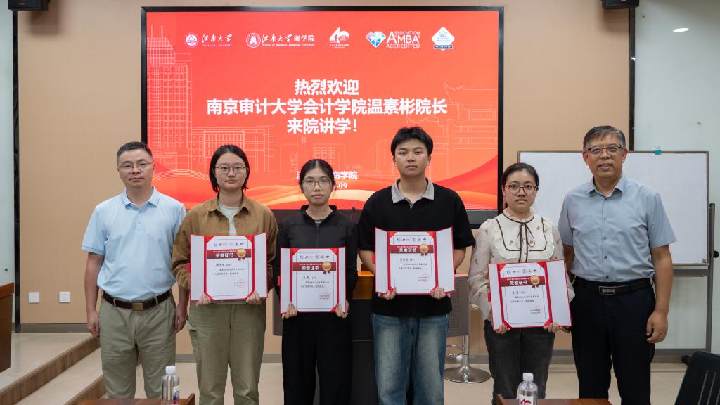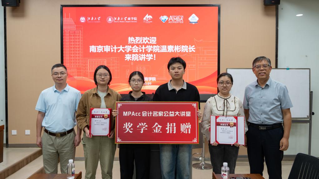 王雷介绍了“MPAcc会计名家公益大讲堂”的相关情况,表示该活动是由中国会计学会、全国会计专业学位研究生教育指导委员会共同发起的一项全国性公益活动,旨在充分发挥会计名家在引领和推动我国会计教育持续繁荣发展方面的重要作用,为MPAcc学员创造更多与会计知名学者交流和学习的机会,从而全面提升学员的综合素质。温素彬教授将本次讲座的全部课酬捐赠给太阳成集团tyc33455cc,用于设立“MPAcc会计名家公益大讲堂奖学金”,以资助成绩优异的MPAcc学员顺利完成学业。根据入学成绩排名,2025级全日制MPAcc学员李蓓、李彤、苏清扬和张宇欣4位新生同学荣获该项奖学金。