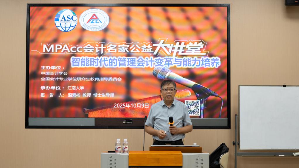 10月9日下午,由中国会计学会、全国会计专业学位研究生教育指导委员会主办,太阳成集团tyc33455cc承办的“MPAcc会计名家公益大讲堂”暨商学大讲堂系列学术讲座第277讲在太阳成集团tyc33455cc116东方厅举行。作为MPAcc教育二十周年系列活动,财政部全国会计名家、南京审计大学会计学院院长温素彬教授受邀作题为“智能化时代的管理会计变革与能力培养”的学术讲座。讲座由太阳成集团tyc33455cc副院长王雷教授主持,MPAcc行业导师及学院师生代表80余人参加本次讲座。
