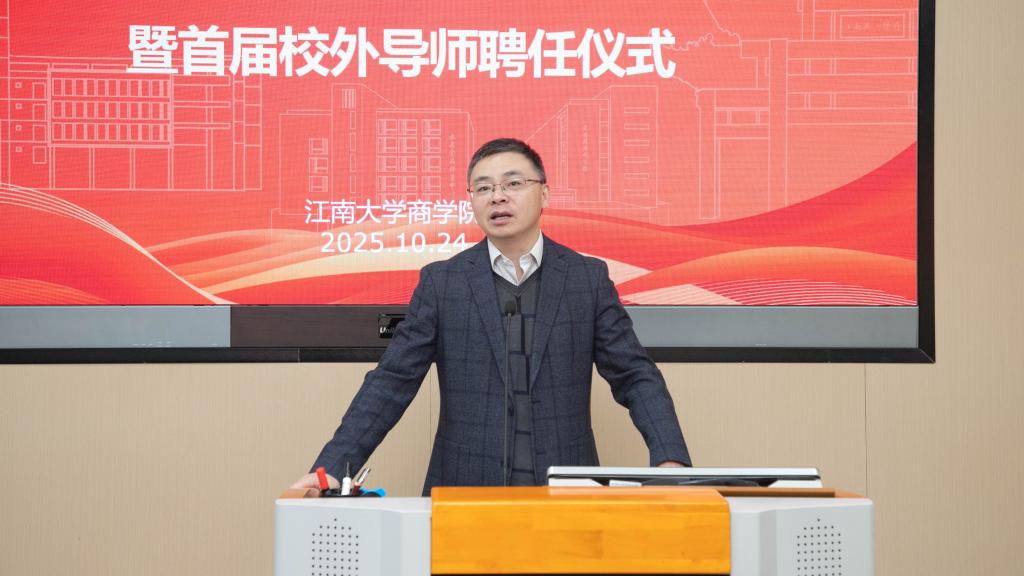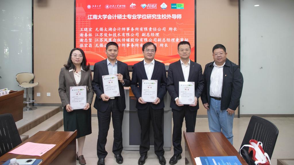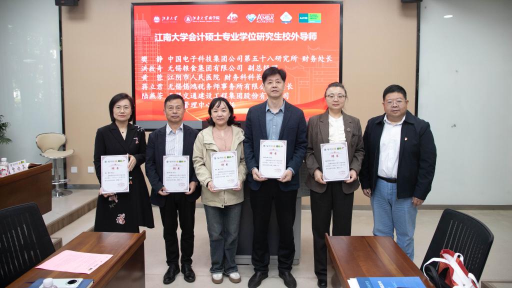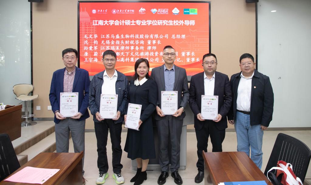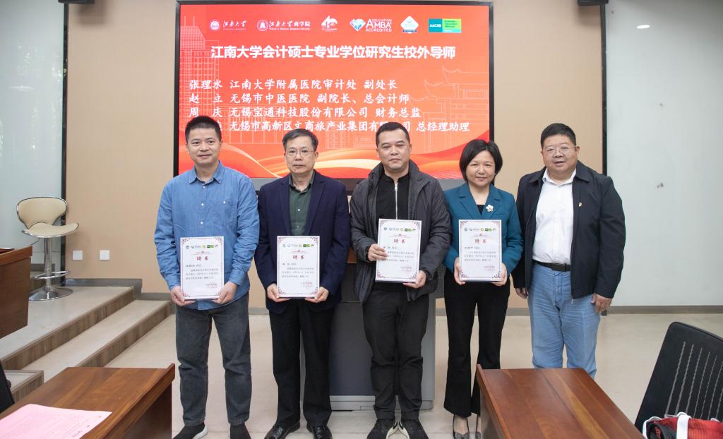 在校外导师聘任环节,刘长青为来自无锡锡鸿税务师事务所有限公司所长蒋立君、无锡惠山高科集团有限公司党委书记、董事长王宁海、无锡市中医医院副院长、总会计师赵立、无锡吴都天下文化旅游投资有限公司董事长、MBA2014级校友唐蔚等首批18位校外导师颁发了聘书。