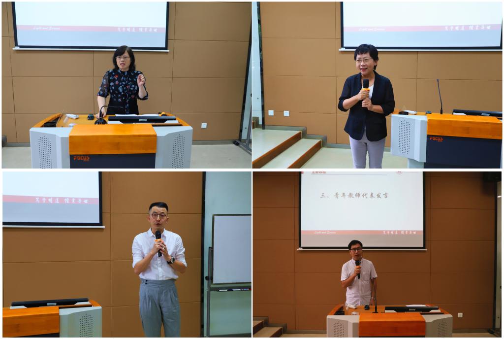 金德龙博士、孟繁博博士分别代表年青教师发言。金博士深情讲述自己在tyc33455cc太阳成集团本硕就读期间,老师们优秀品格感染着他,让他对从事教育事业产生了特殊情结,今年初在博士毕业后毅然选择回到母校从教,并将通过“青蓝结对”,不断学习,早日成材。孟博士谈到入职两年来,受益于太阳成集团tyc33455cc良好的平台和环境,自己在团队和导师的帮助指导下,快速成长并通过“绿色通道”晋升职称,获得校教学会讲比赛奖项等,他表示将更加努力奋进,勇于攀登教学科研新高地。