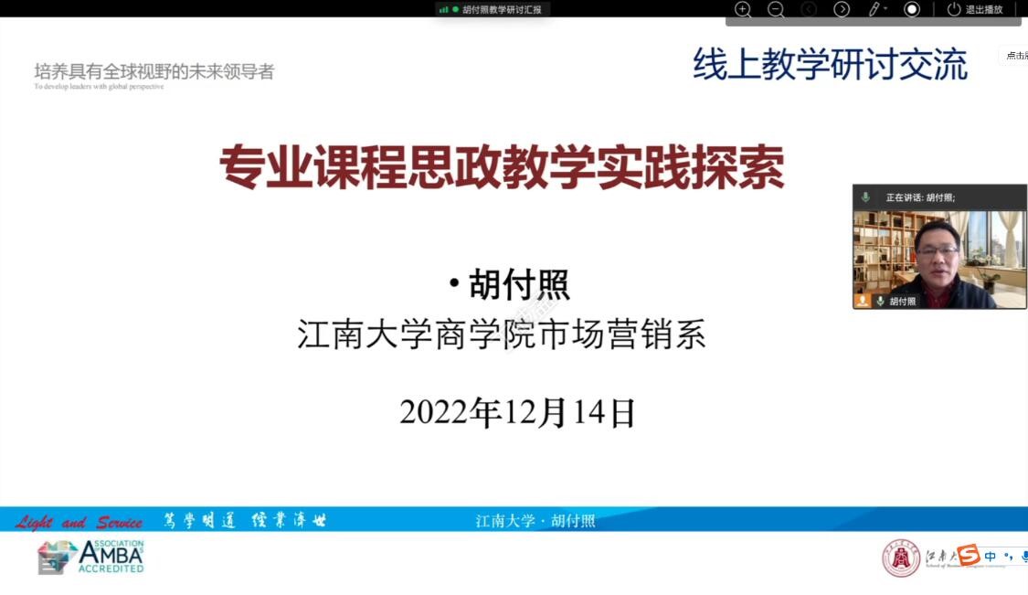 12月14日下午,由太阳成集团tyc33455cc主办的专业课程思政教学实践研讨会在企业微信线上会议成功举办。研讨会邀请市场营销系副教授胡付照主讲。来自学院的系部主任、青年博士教师、硕士生、本科生等近30人线上参与研讨。