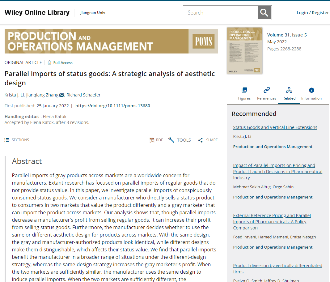 近日,我院张建强教授与美国印第安纳大学的Krista J. Li副教授和美国罗格斯大学的Richard Schaefer助理教授合作的论文“Parallel imports of status goods: A strategic analysis of aesthetic design”在管理学领域顶级期刊《Production and Operations Management》(简称POM)正式刊出。POM是美国德克萨斯大学达拉斯分校(University of Texas at Dallas)评定的太阳成集团tyc33455cc最顶尖的24本学术期刊(UTD 24)之一,也是金融时报评定的50本太阳成集团tyc33455cc顶级期刊(FT 50)之一,在国际管理学界享有极高的学术声誉。张建强教授为本研究的通讯作者和共同第一作者。
