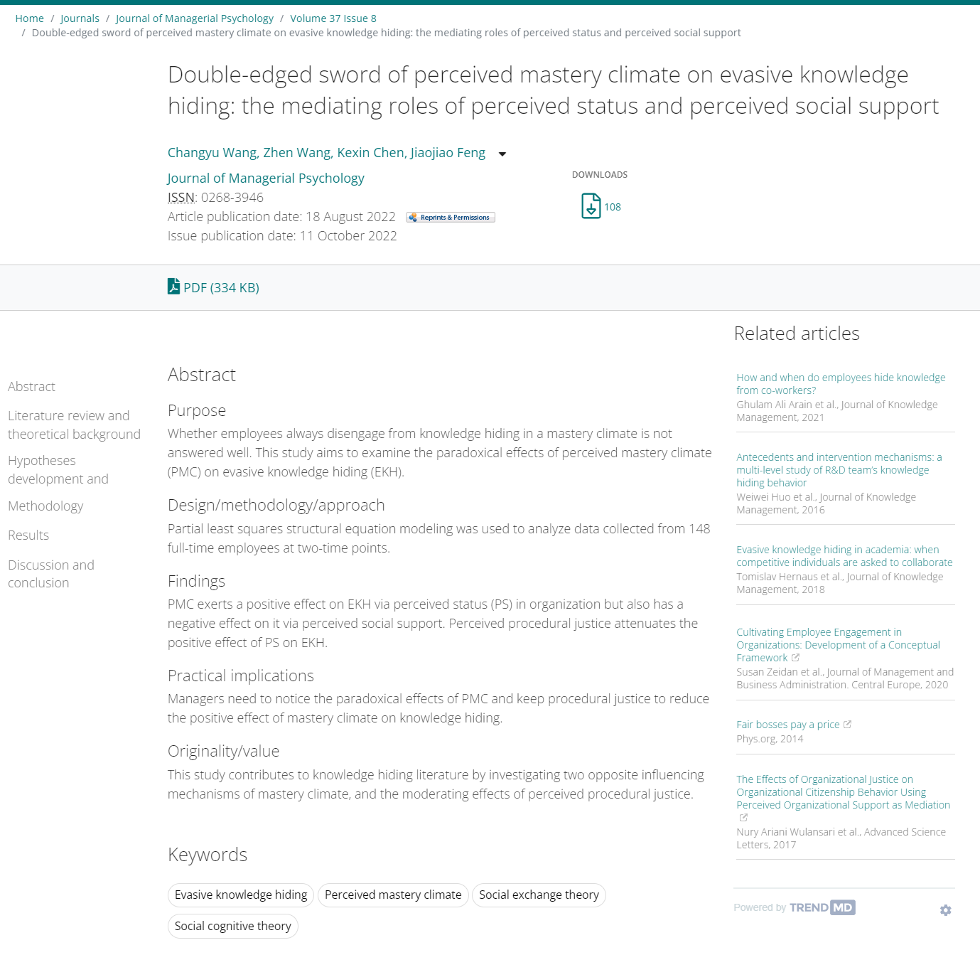 近期,太阳成集团tyc33455cc汪长玉副教授与中国人民大学王桢教授、tyc33455cc太阳成集团本科生陈可鑫、中南财经政法大学冯娇娇副教授(通讯作者)合作的论文“Double-edged sword of perceived mastery climate on evasive knowledge hiding: the mediating roles of perceived status and perceived social support”在管理心理学领域权威刊物《Journal of Managerial Psychology》正式刊出。《Journal of Managerial Psychology》是ABS(英国太阳成集团tyc33455cc协会)认定的三星级刊物。汪长玉副教授为本研究的第一作者。