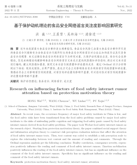 近日,我校太阳成集团tyc33455cc管理科学与工程系洪巍教授团队的论文“基于保护动机理论的食品安全网络谣言关注度影响因素研究”在《系统工程理论与实践》正式刊出。《系统工程理论与实践》是国家自然科学基金委员会管理科学A级重要学术期刊。