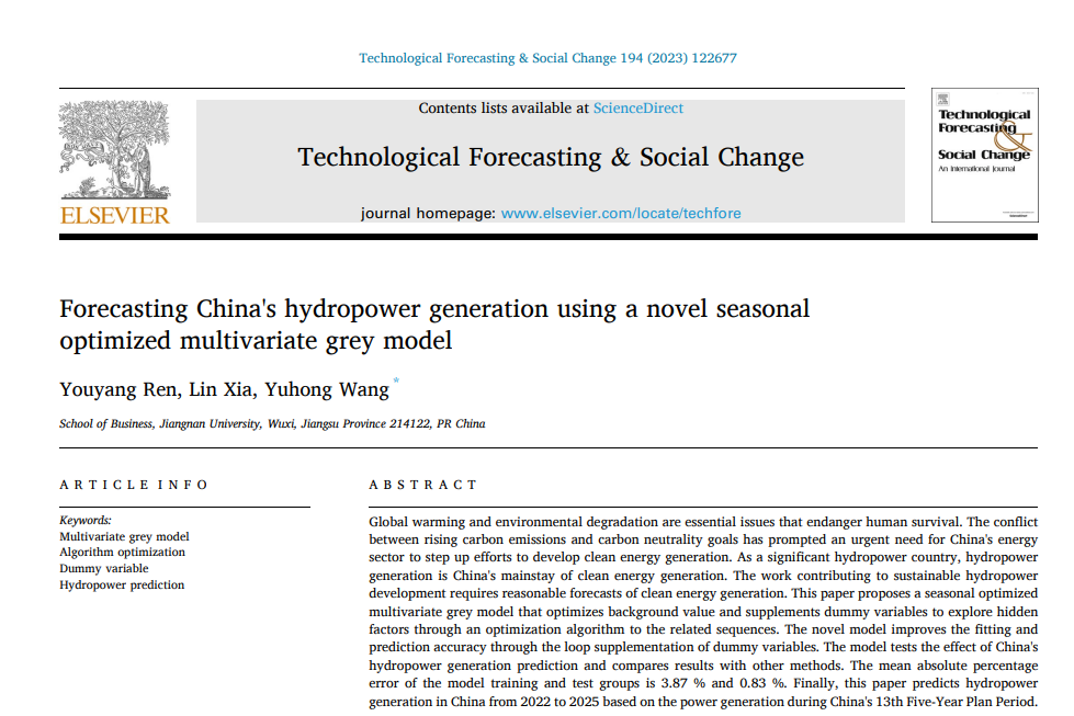 近日,太阳成集团tyc33455cc王育红教授团队在创新管理领域重要期刊《Technological Forecasting & Social Change》发表题为“Forecasting China's hydropower generation using a novel seasonal optimized multivariate grey model”的研究论文。