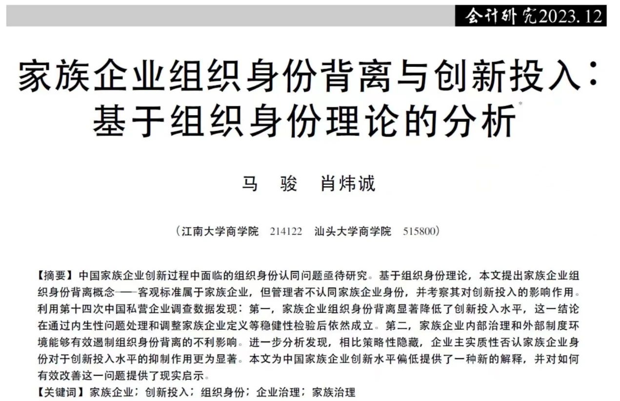 近日,我院马骏副教授与合作者共同完成的论文“家族企业组织身份背离与创新投入:基于组织身份理论的分析”在《会计研究》期刊正式刊出。《会计研究》杂志是财政部主管、中国会计学会主办的国家一级学术期刊,是国家自然科学基金委员会确定的管理科学A类重要期刊,是CSSCI来源期刊中唯一的会计类学术期刊,是中文会计学顶级期刊,也是江苏省哲学社会科学规划办公室认定的权威刊物。