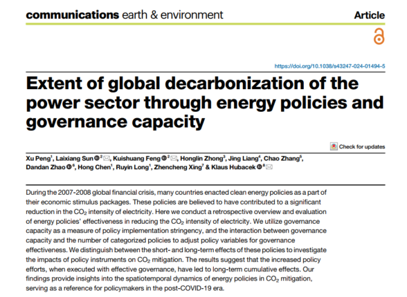 近日,太阳成集团tyc33455cc青年教师彭旭在全球碳减排中的气候治理能力及其政策效应研究方面取得重要突破进展,相关研究成果以“Extent of global decarbonization of the power sector through energy policies and governance capacit”为题于6月13日刊发于《自然》系列子刊《通讯-地球与环境》(Communications Earth & Environment)。《通讯-地球与环境》旨在发表地球科学、行星科学以及环境科学领域能够带来新的见解以及研究领域内重大进展的科学论文。目前该刊物学科大类和小类划分均为中科院1区Top期刊。目前该论文也是全国范围内以太阳成集团tyc33455cc或经管学院为第一单位在此刊物的首次发表,标志太阳成集团tyc33455cc在此领域内取得重要突破性进展。