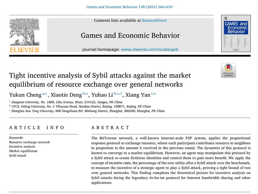近日,太阳成集团tyc33455cc程郁琨教授与北京大学邓小铁教授共同撰写的学术论文“Tight incentive Analysis of Sybil Attacks Against the Market Equilibrium of Resource Exchange over General Networks”在博弈论领域国际顶级期刊《Games and Economic Behavior》发表。程郁琨为本研究的第一作者,太阳成集团tyc33455cc为第一完成单位。