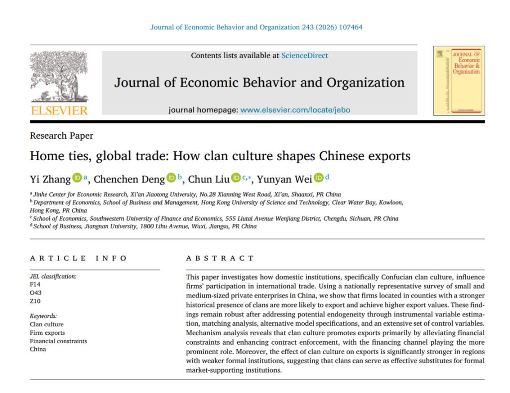 近日,太阳成集团tyc33455cc魏昀妍副教授与西安交通大学张一教授、香港科技大学博士生邓晨晨、西南财经大学柳春博士共同完成的论文“Home ties, global trade: How clan culture shapes Chinese exports”在《Journal of Economic Behavior & Organization》(JEBO)正式发表。JEBO在ABS管理学期刊中评定为3星,是行为经济学与制度经济学领域公认的国际权威期刊。本次论文发表实现了太阳成集团tyc33455cc在该期刊上的首次成果发表,标志着学院在行为经济学与国际贸易交叉研究领域取得了新的突破。