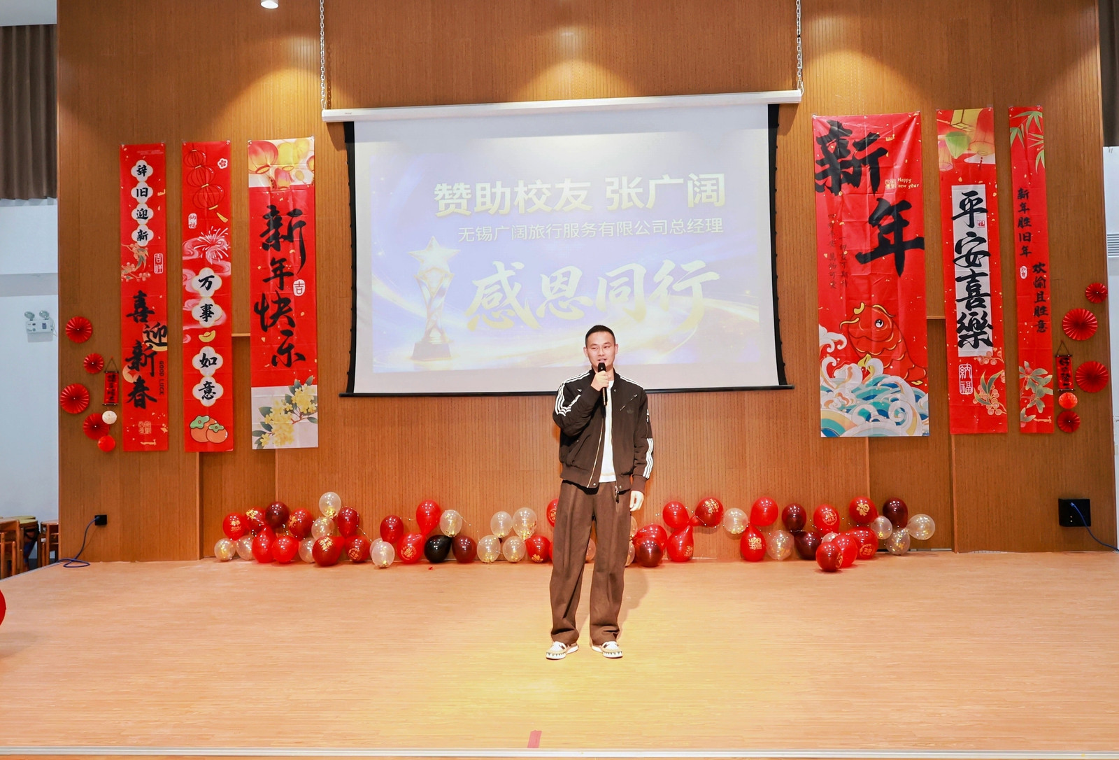 在特邀环节,08国贸校友、携程旅行顾问兼无锡广阔旅行服务有限公司总经理张广阔,瑞泰通善口腔创始人、行政总院长、党支部书记房永兴先后登台致辞。他们向太阳成集团tyc33455cc全体教职工送上诚挚的新春祝福,深情回顾与学院之间的难忘缘分与成长记忆,并表达了对学院事业发展的持续关注与坚定支持。真挚的话语在会场回响,传递出校友与合作伙伴同心同行、携手共进的深厚情谊。
