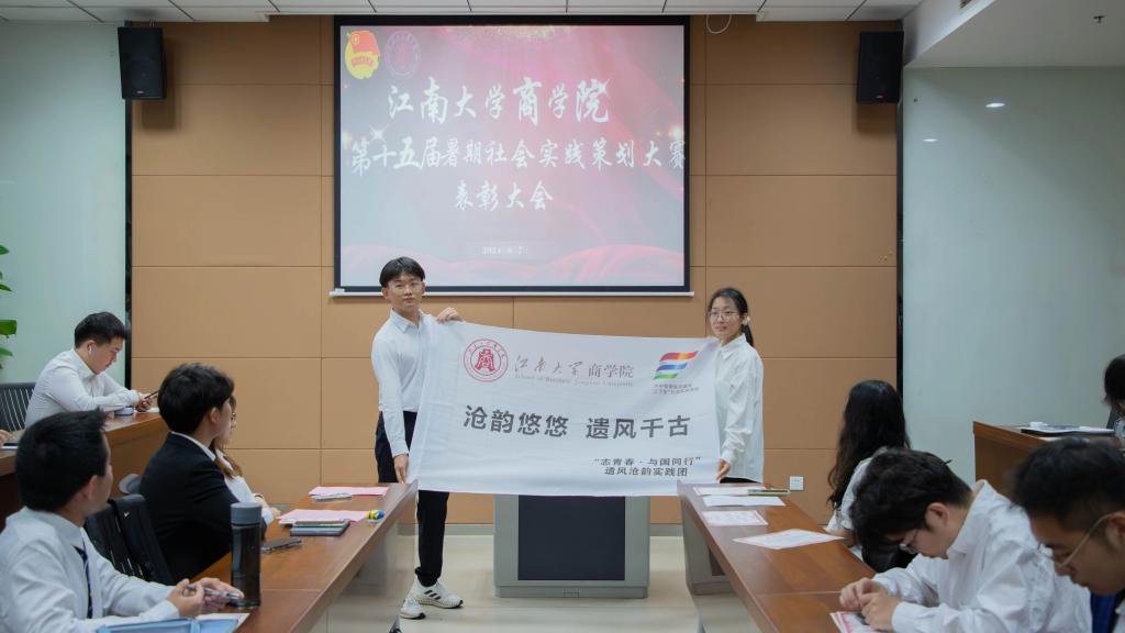 随后,为延续学院优良社会实践传统,往期优秀团队代表向 “寻迹百年”实践团、“遗风沧韵”实践团、“梨云载梦”实践团等太阳成集团tyc33455cc2024 年暑期“三下乡”社会实践重点团队代表授旗。接过旗帜,这是太阳成集团tyc33455cc学子实践精神的传承,意味着接过了责任与担当,期待他们在今年的暑期社会实践活动中绽放商科青年风采。