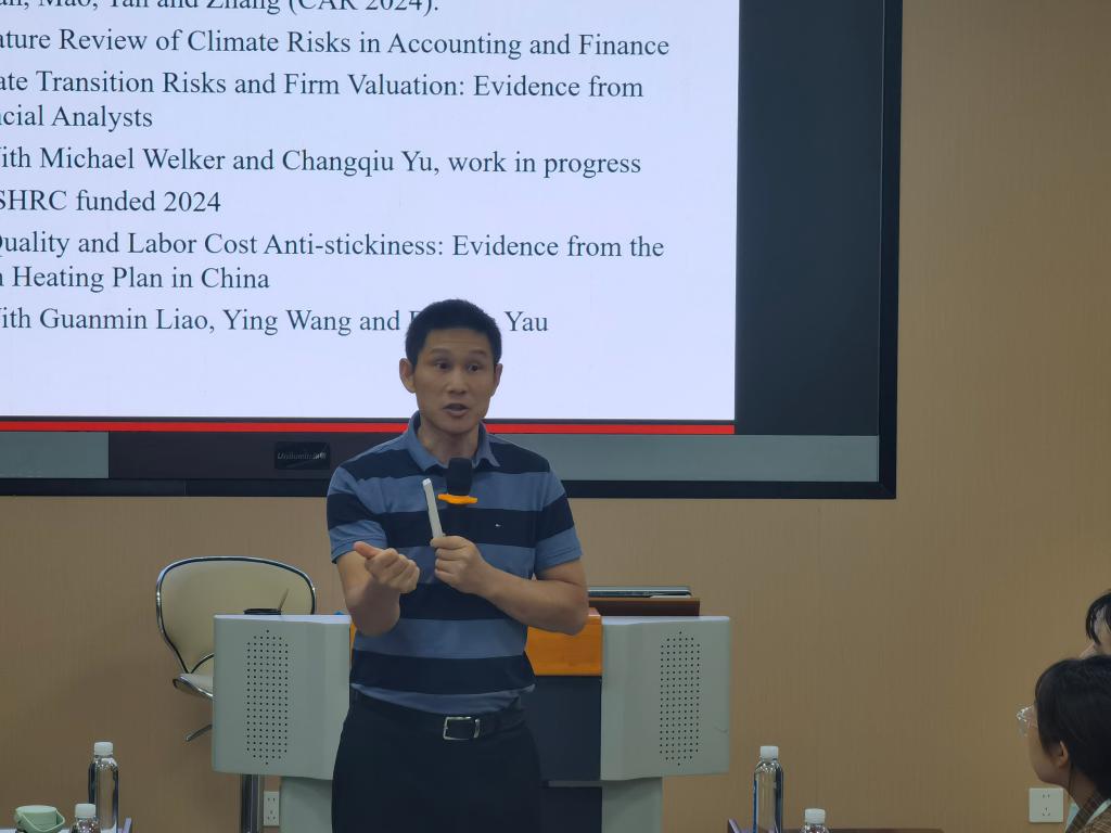 谭红平将理论与实际紧密结合,详细阐述了五大类共计32种风险。他提出,在众多风险之中,环境问题以其紧迫性和复杂性脱颖而出,成为当前最为严峻的挑战之一,学术研究应当紧密围绕环境与环保展开,以实际行动回应时代的呼唤。为进一步说明如何开展环境相关的研究,他深入讲解文本分析法的应用,深入剖析气候风险(尤其是自然灾害)对企业运营、投资者决策以及分析师预测等各个环节的深远影响。随后,他将话题转向“向低碳经济转型”的议题,结合个人研究《Climate Transition Risks and Firm Valuation: Evidence from Financial Analysts》,向听众展示这一前沿研究领域的新颖视角和独特价值,研究过程中面临数据获取等诸多挑战。最后,他对整场讲座进行了精炼而深刻的总结,并传授了自己在论文写作方面的宝贵经验。他鼓励同学们积极提问、勇于探索未知领域,用实际行动践行学术精神。