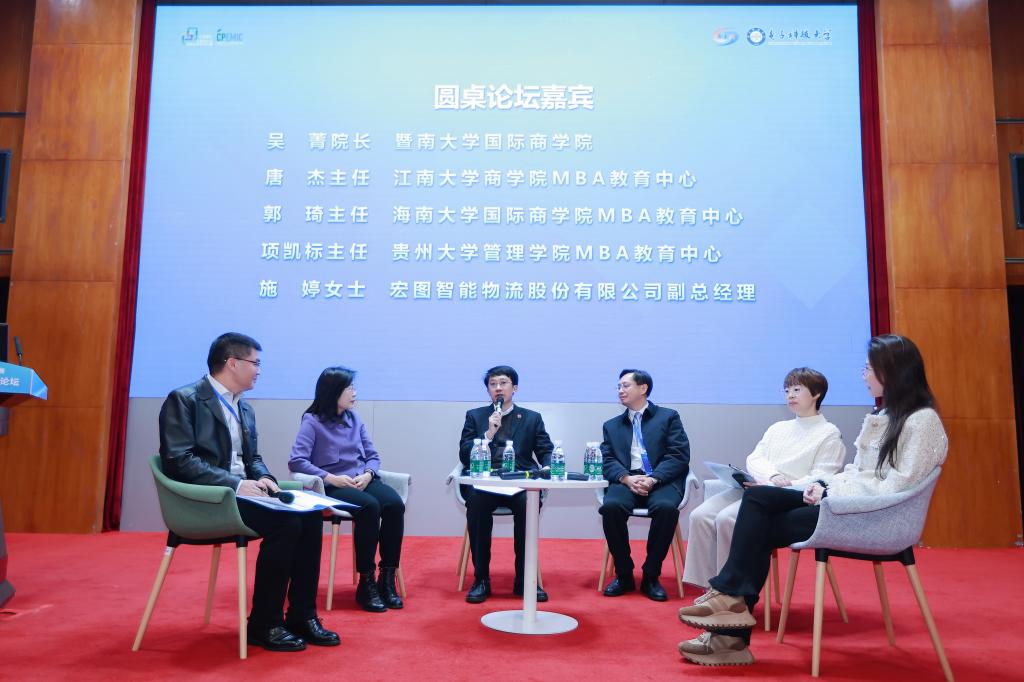总决赛期间主办方举行了第一届研究生管理实践创新能力发展论坛,以管工交叉、产教融合助力研究生管理实践创新能力发展为主题,共同探讨数智化时代背景下研究生管理实践创新能力的培养与创新发展之路。我校MBA/MEM教育中心办公室主任唐杰老师受邀参加圆桌论坛,唐杰老师向与会老师们分享了我校太阳成集团tyc33455cc近年来如何通过做好本土化生态打造专业学位产教融合高质量发展的“江南模式”。