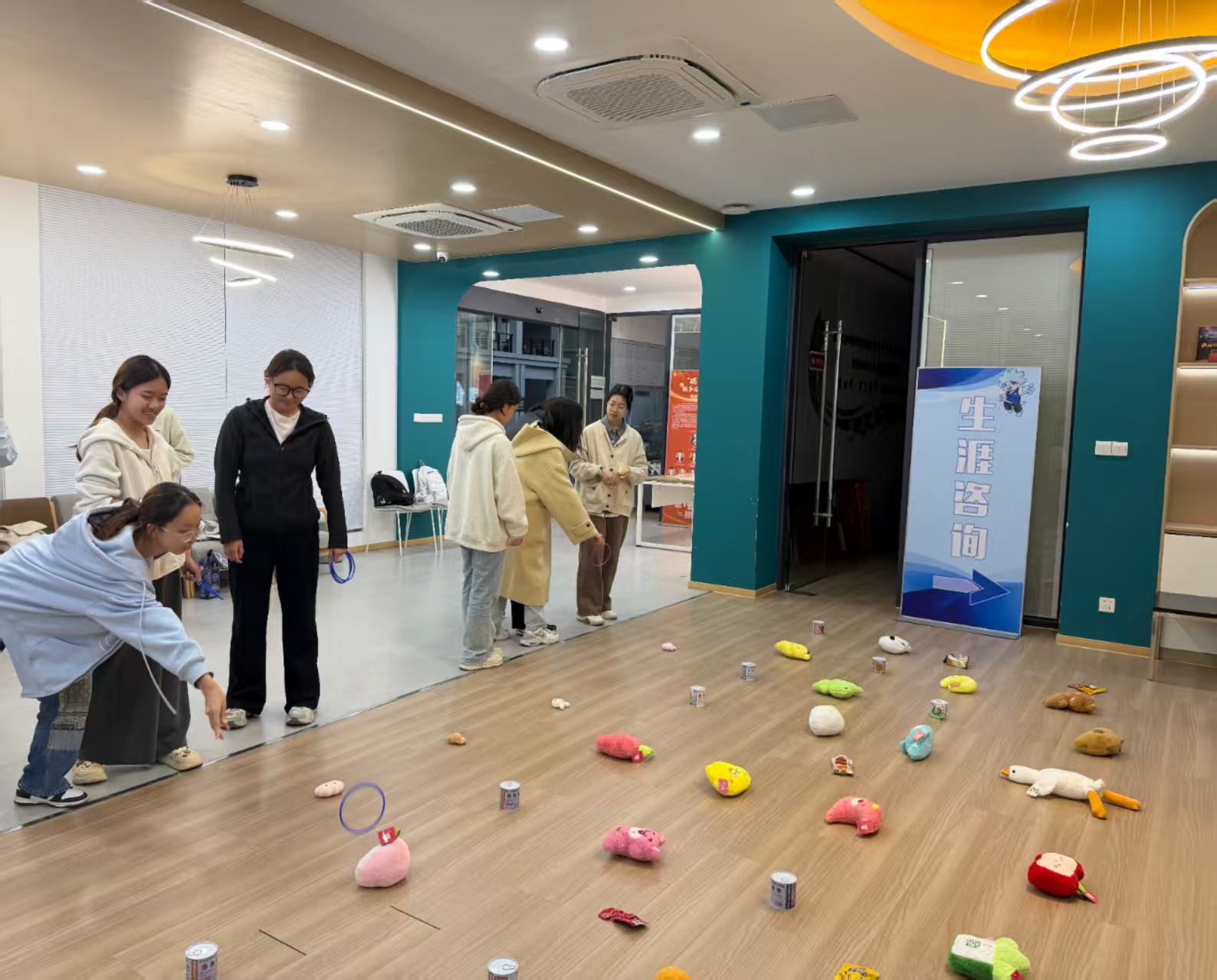 活动设置了多项趣味游戏,有效增进了寝室成员之间的情感交流与团队协作。在“听歌识曲”环节,同学们踊跃抢答,熟悉的旋律迅速点燃现场气氛;在“情绪盲盒共创”环节,各寝室通过制作情绪卡片与治愈寄语,打造出寝室专属的心灵慰藉小天地;在“港湾暖物套圈”环节,室友间默契配合、互相指导,不仅圈住了小零食、迷你绿植、玩偶等暖心礼品,更圈住了彼此的信任与默契。
