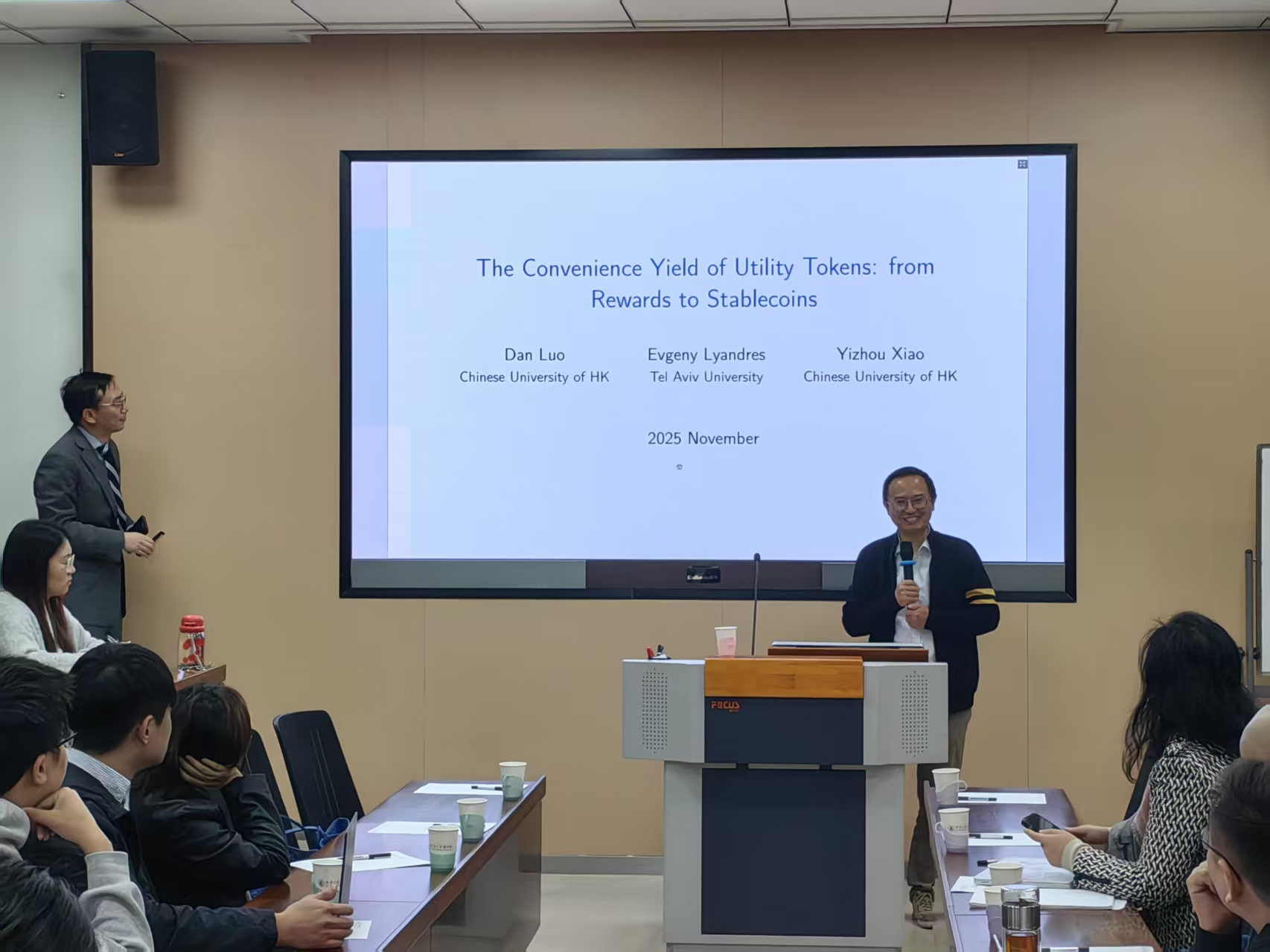 肖弋舟副教授首先阐述了“效用代币”(utility tokens)的核心概念,将其界定为一类兼具金融资产即时灵活性与特定商品兑换限制性的“半流动性”(partial liquidity)资产。为探究该类资产的经济学原理,他以经典的Diamond-Dybvig模型为基础进行修正与拓展,构建了全新的理论分析框架。该框架旨在揭示企业的最优代币发行策略、代币“便利收益”(convenience yield)的形成机制、以及可交易性等设计特性对其价值的影响。他强调,该研究将为理解商家稳定币等金融创新以及企业设计代币机制和监管机构制定相关政策提供坚实的理论指导。