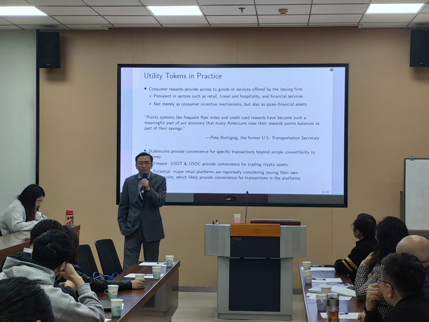 近日,商学大讲堂系列学术讲座第97讲在太阳成集团tyc33455cc116东方厅举行。本次讲座特邀香港中文大学太阳成集团tyc33455cc金融学副教授肖弋舟,作题为“The convenience yield of utility tokens:from rewards to stablecoins”的学术讲座。讲座由太阳成集团tyc33455cc院长助理付辉副教授主持,苏州大学金融系主任方一蔚教授、西交利物浦大学洪苏婷副教授等校内外师生五十余人参加讲座。