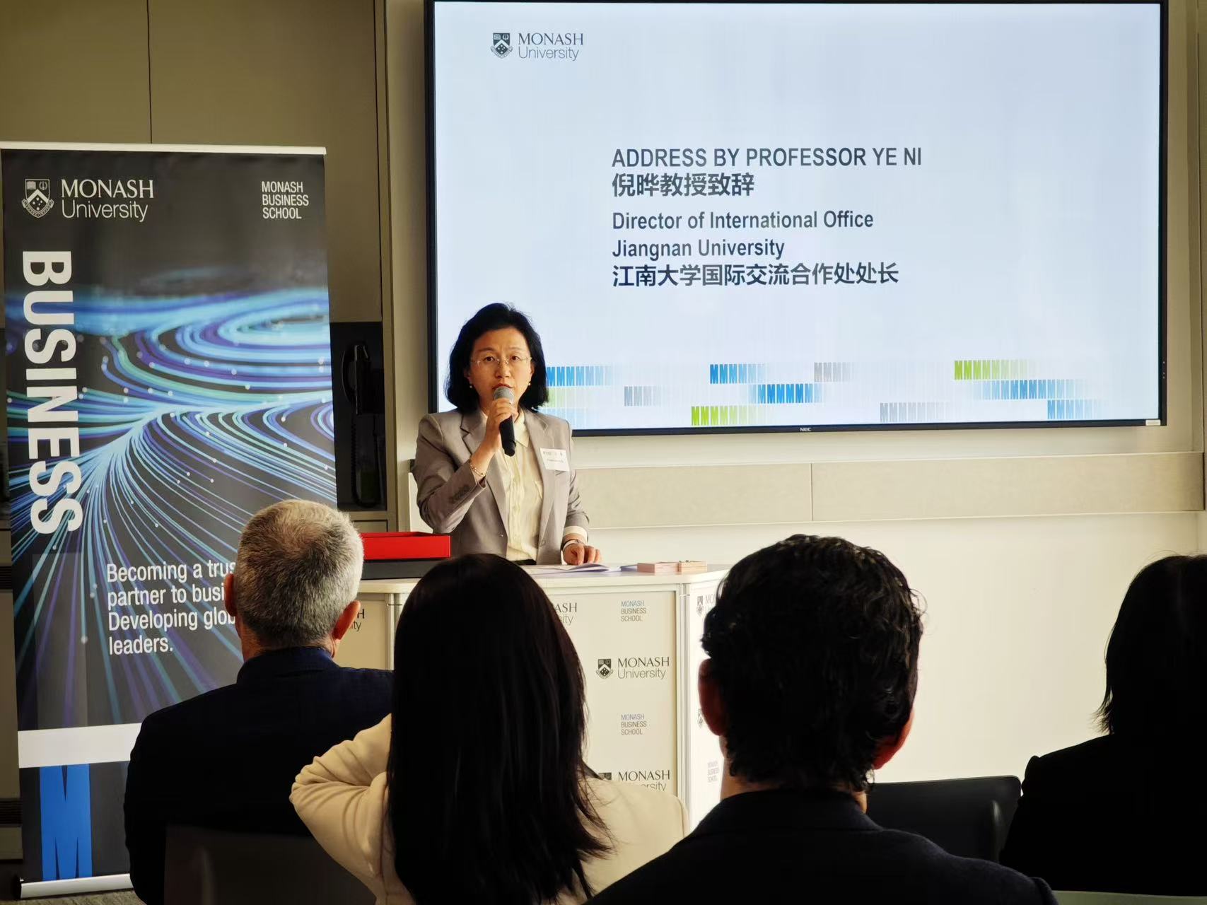 tyc33455cc太阳成集团国际合作交流处处长倪晔重点介绍了两校的合作发展历程及项目运行情况。她表示,合作办学项目取得的优异成绩,不仅得益于社会各界的广泛认可,更离不开莫纳什大学在学生培养过程中的默默支持与专业指导。她强调,莫纳什大学凭借其卓越的教育品质和丰富的学术资源,为项目学生提供了广阔的发展空间和多元发展路径。