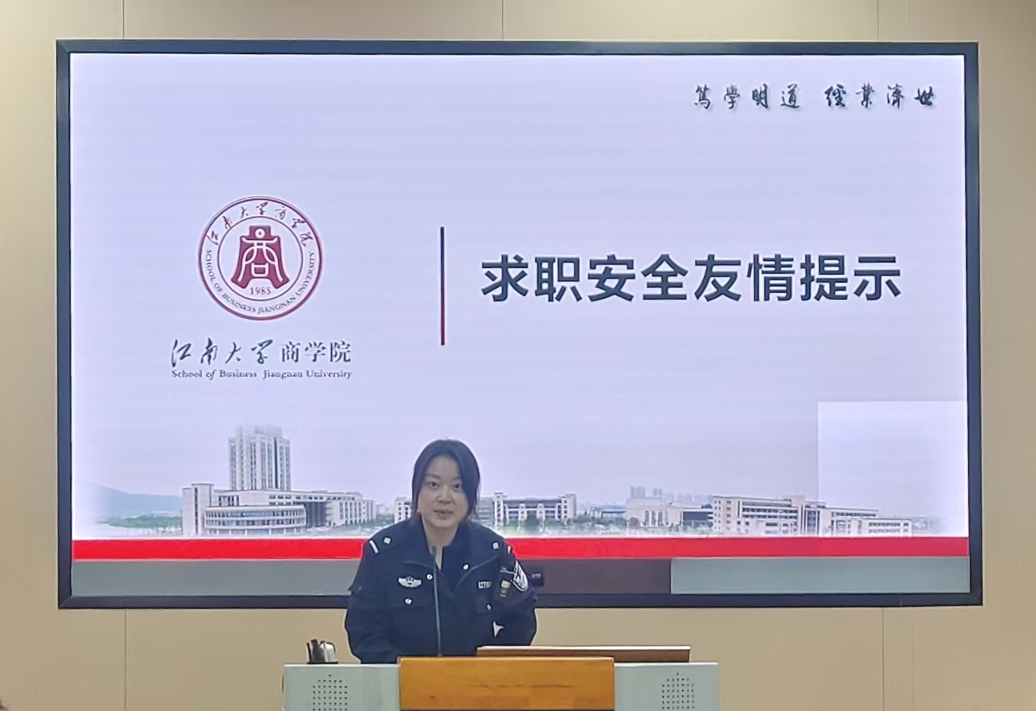 吴昀霖开展求职安全及反诈教育宣讲。她结合近期高发的诈骗案例,重点剖析了“网络刷单”和“冒充熟人借钱”两类学生最容易接触、受骗风险较高的诈骗手法,提醒大家在求职和日常交往中务必保持警惕,不轻信来历不明的信息,不贪图小利,切实保护好个人财产与人身安全。她建议同学们主动学习反诈知识,遇到可疑情况及时与学校或警方联系,共同筑牢校园安全防线。
