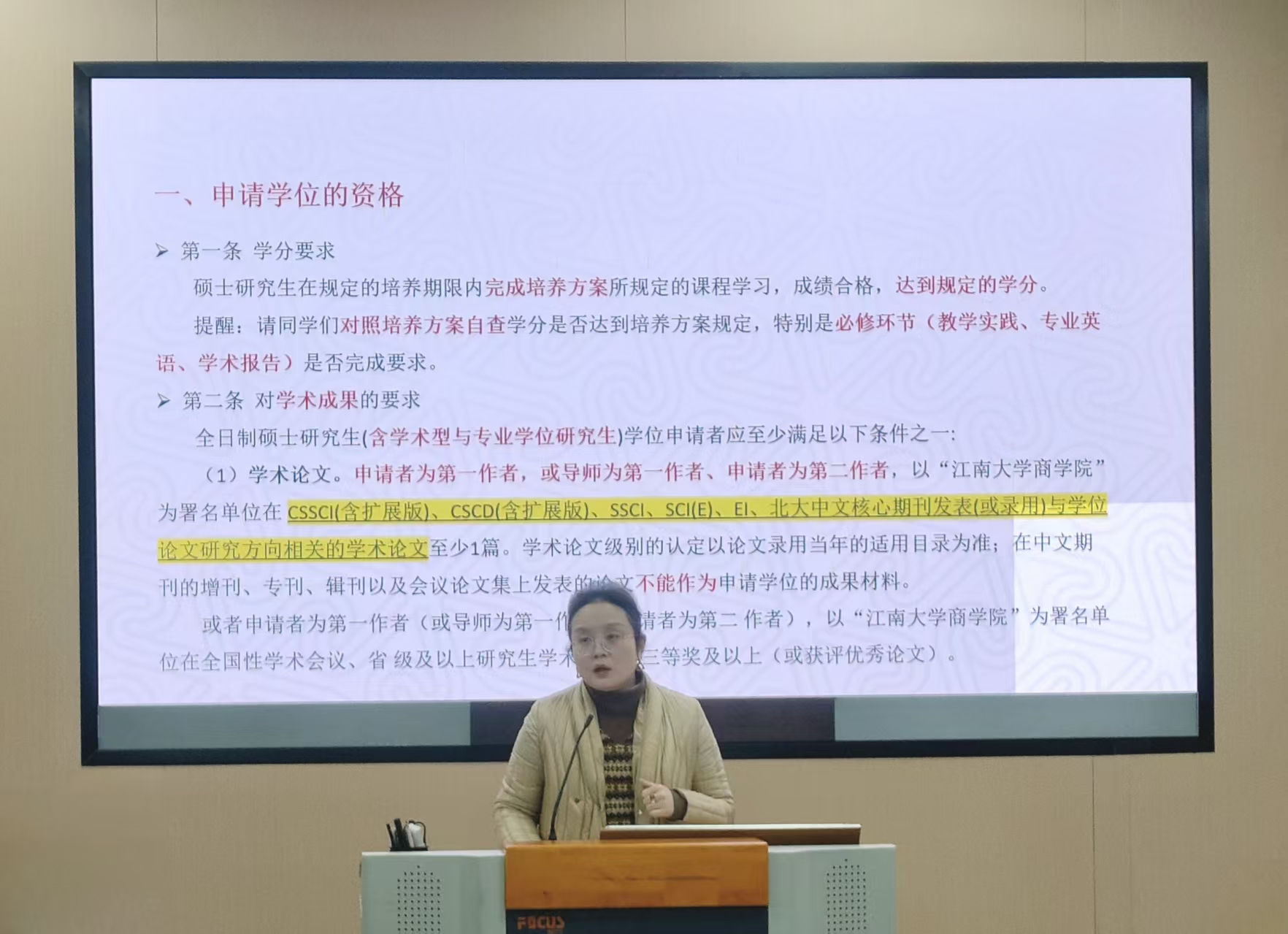 胡文亮就研究生毕业资格审核进行详细说明与重点提醒。她详细介绍了课程学分要求、科研论文发表、毕业论文撰写等全日制硕士研究生申请学位所需满足的具体条件。她特别强调,学位要求不仅是学术标准,更是激励大家勤学奋进、勇于担当的动力,希望同学们积极提升科研能力、学术水平和创新精神,同时恪守学术道德,严谨完成学位论文。