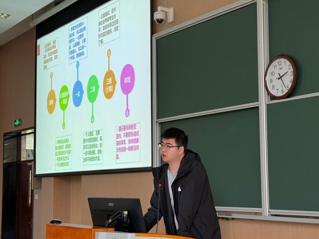 在经验分享环节,大数据2201班张鸿恩围绕信息搜集与求职决策,对比分析了各类信息渠道,强调应聚焦目标、避免分散发力。会计2202班王君洁结合自身入职经历,系统梳理了银行求职全流程,建议采取“分层次投递、多手准备”的策略,并重视心态调整。