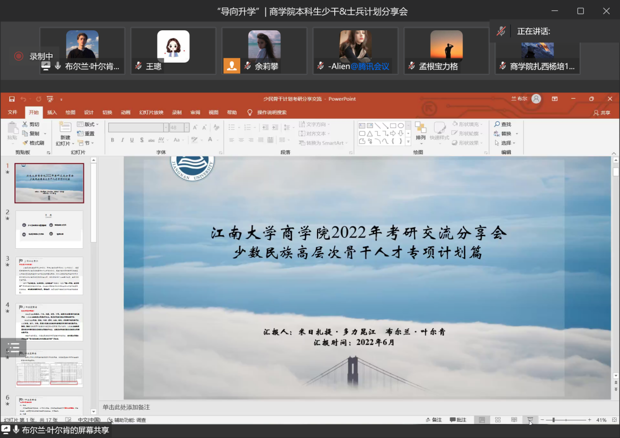 接着,三位嘉宾依次进行分享。米日扎提·多力昆江同学和布尔兰·叶尔肯同学分享了自己备考“少数民族骨干计划”的经验与心得。米日扎提·多力昆江同学从“如何选择学校专业”和“如何备考”两个方面为2022年考研的学弟学妹们做了经验分享和指导。首先,他讲到,考生确定报考学校和专业要从自身实际出发,同学们要根据自己未来职业规划、目前的学习成绩和复习效率,考虑是否要报考本校、是否跨专业、是否尝试保研等。其次,他还对考试内容和形式作了介绍,鼓励同学们确定明确清晰、能够实现的考验目标,制定合理健康的备考计划。同时,他还特别提醒同学们要注意报名备考时间节点和重点事项,鼓励同学们相互合作、共同进步。最后,代表太阳成集团tyc33455cc往届研究生学长学姐对2023届考生表达了美好祝愿。