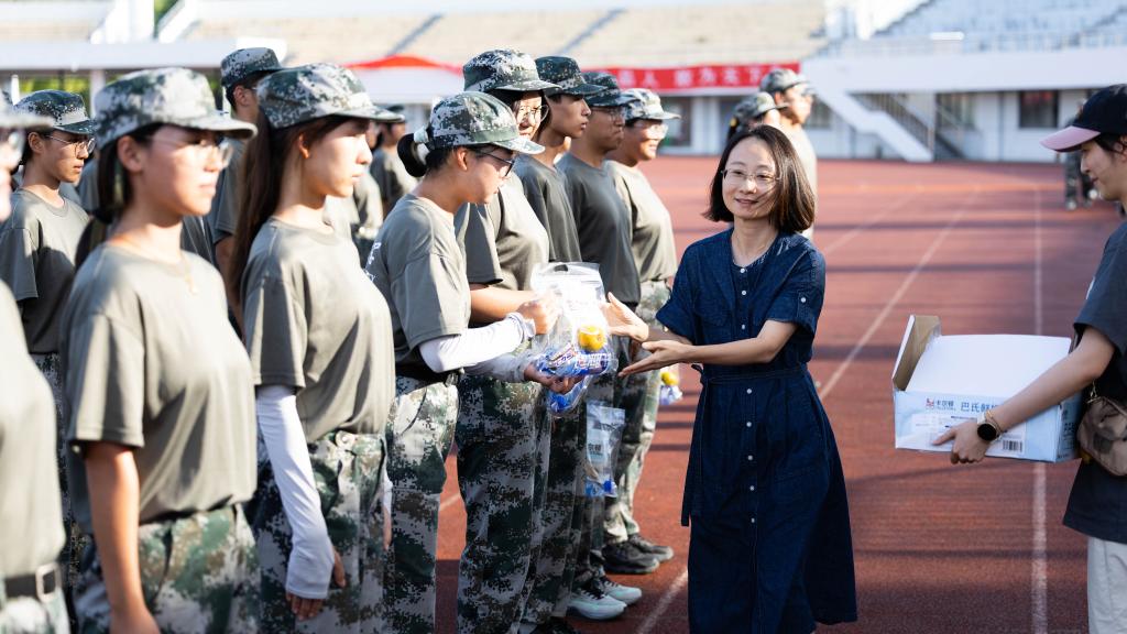学院领导老师为参训学生分发精心准备的慰问品,并与同学们亲切交流。同学们有序领取,脸上洋溢着笑容。这份心意不仅为同学们带来清凉,更传递了学院对学生的深切关爱与期望。