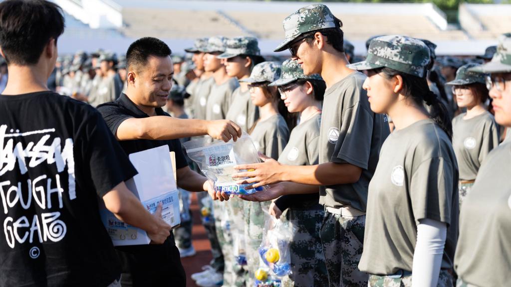 浦徐进为军训学生分发慰问品