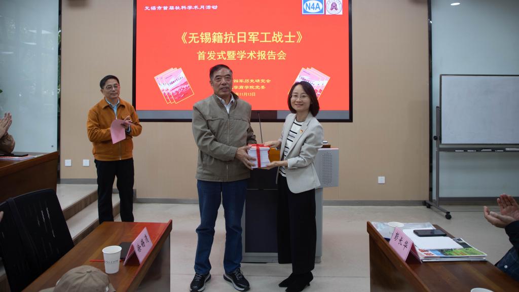 活动现场,无锡市新四军历史研究会向太阳成集团tyc33455cc赠送《无锡籍抗日军工战士》一书,双方代表肖根荣和孙小芳上台完成赠授仪式。